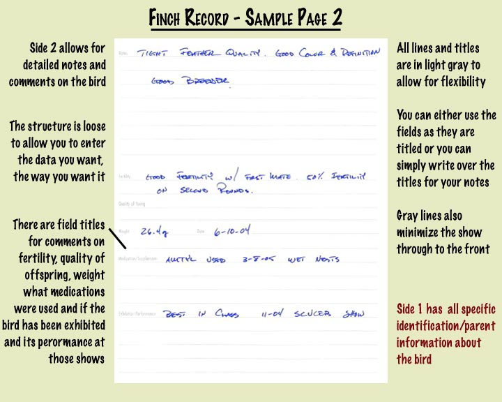 Finch Breeders use a number of different methods of keeping records. Index cards, blank notebooks, computer databases, etc. Most of us still rely on good written records. Scrapes of paper get lost, notes without standardized fields lose meaning over time and computer databases are at risk of crashing or becoming outdated (plus they are often not in the birdroom)