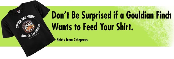 Gouldian Finch - Chloebia gouldiae - The pearlescent nodules in the corner of the mouth reflect light so the gaping mouth is easy to see in the dark nest. Parrot finches are the only other estrildids to have these. | Heck's Shafttail - Poephila acuticauda hecki - A modified domino pattern that shows the migration of the dots towards the pattern seen in Lonchuras. Similarities to Star and Plumhead finch. | Masked Grassfinch - Poephila personata - While the domino pattern is typical of the Australians, the lack of a closer relationship to the Shafttail is surprising. However, these species are often seen together in the wild. Nest differentiation? | |||||||||||