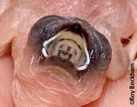 Rufous-Backed Mannikin - Lonchura nigriceps - A double-horseshoe pattern is seen in this African mannikin. The tongue moves rapidly back and forth along the pattern. | African Silverbill - Lonchura cantans - A single horseshoe pattern that is elongated to the extremes of the mouth. Dark color and fleshy flanges are similar to the Red Headed finch (below) | Pearl Headed Silverbill - Lonchura griseicapilla - A fairly unusual palate marking especially for a Lonchura species. The chick also has a lot of fuzz which is unusual for this genus. | |||||||||||