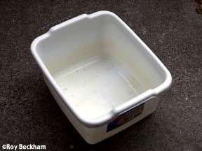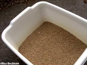 Start with a plastic or metal container. Smooth straight sides to keep the worms and beetles in. I use a large plastic dish pan. Nothing special. | Fill the pan with a couple of inches of Chick Crumbles or some other high protein poultry meal. Don't fill it to the top. You'll need the room as time goes by. | |||||