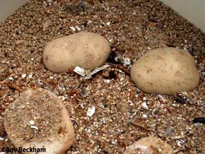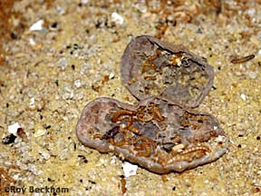 As the mealworms grow and shed their exoskeleton, they will leave behind a paper-like hull. These can easily be blown away. | To maintain the colony, just add some more poultry crumbles on top as well as adding more moisture food every now and again. Eventually it will fill up with a sand-like substance (mealworm poop) and it's time to start a new colony. Here they have just about finished some of the potato added earlier. | |||||