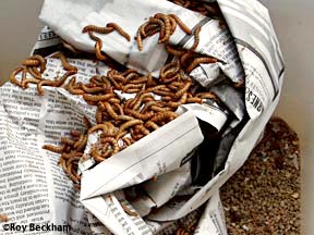 Tips: Adult beetles can fly. To keep them from leaving the culture, use a screen top. While I have no evidence that the antibiotics are transferable from feed to the worms, why take the chance. Use a poultry feed that does not contain antibiotics commonly used in many chick starters. The growth rate of the worms is dependent on the temperature. Warmer weather results in a faster growth rate. Cooler weather retards their growth. Rotate several colonies at different stages of development and you'll have a steady supply of worms You'll usually find plenty of worms under the moisture food on the top of the crumbles. Birds often find the freshly molted worms (white color) easier to eat since they do not yet have a hard exterior. Some birds also like the pupae and they have the advantage of not being able to crawl away. |