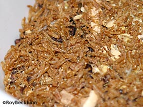 If you're starting a new colony or just need to increase the size of an old one, add in your new worms now. Here some new mail-order worms are unpacked. They're shipped in crumpled paper. | Place some moisture food on top such as potato, banana peels, carrot slices or apple. Put in the worms, beetles, pupae and any dried up vegetable remains from a previous colony on top as it may contain eggs. | |||||