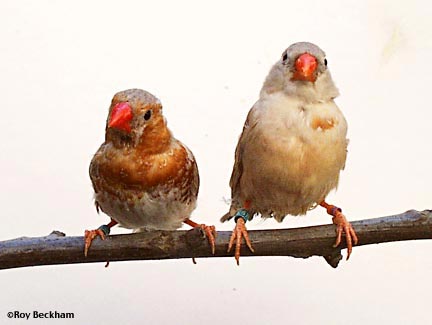 Mutation Effects Male: Every marking on the Black Breasted finch is altered in some way. The cheek patches are enlarged, feathering at the outer edges. The tear mark is missing. The flank spots are elongated and enlarged, sometimes to the point that it looks as though the flank has been replaced with chestnut colored spots or streaks. The upper tail coverts are buff colored and the tail bars are elongated so that they run vertically on the tail coverts (see below). The breast bar is enlarged, giving the mutation its name. Often, there is also some orange or white lacing on the wings. Female: The tear mark is missing and the rump and tail are buff colored like the males (see below). As with the males, there can be some orange or white lacing on the wings. Fledgling: Black Breasted chicks can be identified in the nest. They resemble females with buff cheeks and tail coverts. The tail lacks the bars. They look a little like Penguin Zebra finches. Black Breasted chicks in the nest (click to view)