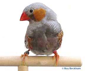 Mutation Effects Male: The space between the tear mark and the beak (lores) is changed from white to black and the breast bar is extended towards the vent making the underside of the male black. The extent of the black is variable. The flanks have a tendency to lose the spots, but this is not so in all cases. The tail coverts also carry more black. The white bars are more narrow. Female: Black Face females have only subtle differences from normal hens and are easily passed over. The white between the tear mark and the beak is gray instead of buff white and there is often an extension of gray down from the breast. The tail bars are similar to males. because of these subtle marks, it can sometimes be difficult to distinguish BF hens from normals and the problem is exacerbated in other colors like fawn and CFW. Combinations The Australians also have an extremely dark version where the black extends from breast to tail. These are often referred to as Black Bodied, but these are still genetically a BF Zebra, not a new mutation. These birds were achieved through multiple BF x BF crosses. Some Australians have told me that if you mate a Black Bodied Zebra to a normal, the result is a Black Face rather than Black Bodied. The Black Face mutation does conflict with the Florida Fancy mutation in that the BF extends the black areas while the Florida Fancy mutation is suppressing the black. They are still often combined because once these two mutation are then combined with the Orange Breasted mutation, the results are a striking bird with lots of orange on a white base. The Black Face mutation probably conflicts with the Penguin mutation. I would expect the Penguin mutation to suppress all of the features of the Black Face Zebra. Black Face Fawn Cheek (click to view) Notes There is a condition known as melanism that causes usually white areas on a bird to change to black. Melanistic males will look very much like Black Face males, but melanistic females are also black unlike Black Face females which are gray. These black areas are often quite blotchy and are not the even black seen in Black Face Zebras. While the BF mutation is genetically controlled, melanism seems to be a metabolic malfunction, possibly having something to do with the liver. (Melanistic female and another shot. Close up of belly Notice the blotchy coloration. This is the worst case of melanism I have ever seen. I sold this normal female to a pet shop a year or so earlier. I brought her back home to see if I could reverse the melanism.) |