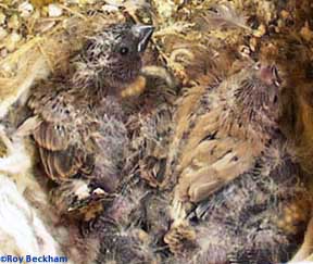Mutation Effects Male: The fawn mutation changes the normal gray and black coloring to a light brown or fawn coloring with dark brown markings. The male cheek and flank marks are nearly the same color as the normal, but are slightly diluted. Males will often have a buff colored belly and some standards consider this a fault, preferring a white underside, while other standards call for it. All markings normally black will be changed to a dark, chocolate brown. The base gray color changes to the light brown. There is some variation in the depth of that color. Female: Like the male, the base color is changed to a light brown or fawn color. Tear mark and tail markings are dark brown. The belly will be buff like the normal if not more so. Fledglings: Fawn chicks will have light colored skin in the nest compared to the dark, near black of the normals. The beak will be horn-colored. As soon as the feathers are visible, the fawn coloring can be seen. The eyes of the chicks may appear ruby red. Fawn nestling in with its Gray siblings (click to view) Identifying Splits Female: Females cannot be split for a sex linked gene. Combinations Combinations with the other sex-linked mutations requires a genetic phenomenon known as crossing over to occur before Fawn and the other mutation can be combined. Crossing over is a random occurrence so one cannot predict how long, if ever, before the combination will occur. Fawn Lightbacks can be attractive birds, but are not easily distinguished from regular Fawns except for the white belly in both sexes. Fawn CFWs are occasionally seen, but I do not find them that attractive. I think the charm in the CFW comes from the contrast of normal markings on an otherwise white bird. The diluted markings on a Fawn CFW do not have the contrast to make them appealing to me. Black Breasted Fawn (click to view) Notes Fawn birds often have a type of feathering known as buff. This is a 'fluffier' feather type and often helps with the apparent type and size of the bird. Buff feathered birds can have markings that are not as sharp or crisp looking though and with the Fawns tendency to have a really buff type of feathering, markings can suffer. The best matings may come from buff x tight feathered birds. The Fawn used to be known as 'Cinnamon', but that term is no longer used. The name Cinnamon should be applied to yellow ground birds like the Canary and Fawn to white ground birds like the Zebra. |