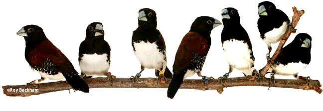 The clutches ranged from 4-7 eggs with incubation starting on the 3rd or 4th egg. The incubation period lasts about 13 days and the extremely tiny chicks hatch out with very little down. The first clutch I hatched was under society fosters and I had serious doubts about their ability to feed something so small. They did very well under society finches though. The imported RBMs would sit diligently enough, but would eject many of the young. I'm hopeful that the domestically raised Rufous will be better parents than the imports since they are used to my birdroom routine and foods. The chicks are ready to fledge in about 20 days (1 week old chicks). The young are dusky gray-brown with a brownish back. They are weaned at about 3 weeks and should stay with either the parents or fosters until you are sure they are independent. You will notice some interesting behavior after fledging that seems to be typical of African mannikins. The begging young will raise an opposing wing when being fed. This seems to make the chick look bigger as well as block the parents from the clutch mates. The fledglings will return to the nest at night to roost with the parents. The molt into adult colors occurs rapidly and begins at around 1 month after independence. (Update: 2/2002) Since raising my first young under society finches, I have been successful in raising young under the Rufous-backs. I paired fostered x imported and fostered x fostered in 15" x 18" x 17" cages. I was also successful in getting a pair of imports to breed in the same conditions. I offered half open nest boxes with the same coco fiber and white feathers that were offered to the original imports. Some pairs would sit very tightly on the nest and would always have at least one bird in the nest until the chicks were ready to fledge. All the birds raised their young on a seed and eggfood diet. As the chicks reach independence, a close eye must be kept on them. The parents will begin to drive them away and I believe that the male will drive any male fledglings even harder. If they begin this, it is best to remove them quickly. The can be killed by the parents. (Interestingly enough, I saw this behavior more from the imports than from the pairs that included a fostered male) Additional Notes As breeding season approaches and the birds come into condition, watch them closely if you house them in groups. The word I've seen applied to RBMs is unpredictable. One day they may be calm and peaceful and the next you'll find weaker birds being mercilessly chased to exhaustion or death. Same goes when mixing individuals or smaller groups with an already established group. If you're going to mix to groups of adults or a lone adult to a group, try to move all the birds to a new cage at once. By the time they figure out what's going on they have formed a new colony. Sometimes adult birds will give fledglings a little more latitude when being introduced together. Probably the lack of markings and dark bill are indicators to the adult that the new bird is not a threat. Still, be cautious. The young are no match for an aggressive male that is clearing his space and are easily killed. Mouth markings are typical of the lonchura family. The African mannikins have a "double horseshoe" shape that is distinct from the Asian mannikins "single horseshoe" pattern. The tongue, which is also marked, will flutter back and forth following the pattern of the upper palette markings. The old Latin name suggested that the Rufous is a subspecies of the Black and White mannikin (Lonchura bicolor), but the Rufous-back is now classified as a distinct species (Lonchura nigriceps). |