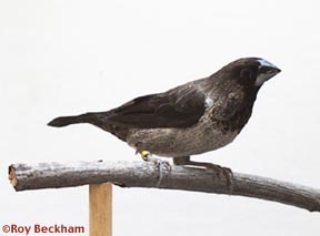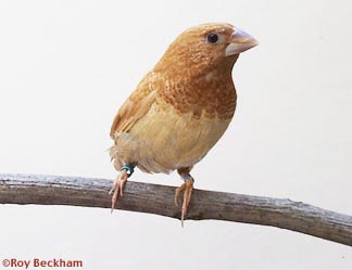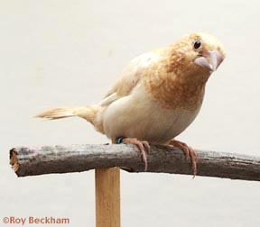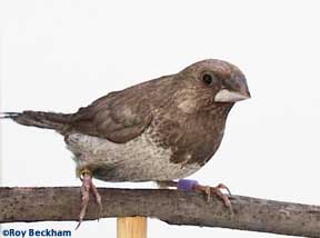 Common Names Description It used to be believed that the Society finch was a fertile hybrid developed from unknown members of the Lonchura family. Tests have shown that the Society finch is a domesticated form of the White-rump mannikin. Just one look at the Chocolate self and a White-rump mannikin and there can be no doubt of their relationship. Color Varieties There are a few other mutations and colors. Dominant pieds that are mostly white, all white birds, true albinos, a dilute called creamino and there is a trend in Europe to hybridize the Society with other Lonchura to introduce different colors. The Black Browns are an example of their efforts. There are also a number of feather mutations like crests. There are numerous frills that cover nearly every part of the body, including things like chest frills that cause the feathers on the breast to point out or upwards. I personally do not find these all that attractive. While combinations of the color modifier mutations (Gray, Pearl, Dilute and Ino) are possible with any of the base colors (Chocolate, Chestnut and Fawn), the base colors cannot be combined except in purely random occurrences. Some birds showing Chocolate, Fawn and White on one bird have been produced and are called Tri-colors (not to be confused with Tricolor nuns) but cannot be reproduced. Diet Breeder's Notes They will take a variety of nestboxes, baskets or just about anything that will hold them and their eggs. I prefer to use a standard finch nestbox with a half open front (click to see). Some of them are master nest builders, but most are happy with just a few strings, feathers or other materials dropped in the box. Incubation will begin sometime after the third egg, but some pairs can get so excited about the whole process that they may start after the first egg. If this occurs, it is possible to remove the eggs as they are laid and replaced with dummy eggs until a full clutch is gathered with the usual clutch ranging from 4 - 8 eggs. This is rarely necessary though. Incubation lasts for approximately 13 days and then pink and naked chicks are born. The Society finches are diligent parents and will take care of even very large clutches. Some pairs can be intolerant of chicks that lag behind in size due to a late hatch, while others have no problems. The chicks will fledge in approximately 21-25 days and are independent with another 2-3 weeks out of the nest. The entire family will continue to roost in the nest at night. Any chicks left with the parents after independence will stay in the nestbox and may even help with incubation and feeding duties with the next clutch, but it is often better to remove them for the same reasons you would remove other adult Society finches. You must actively stop the breeding pair after the desired number of clutches has been raised or they will continue to raise clutch after clutch. It is at this time that I will keep a large group of them together. No nestbox is necessary for roosting as they will all clump together for the night. They will attempt to breed as young as 3 months, but as with many species, it's best to wait for them to reach 6-8 months before breeding. If you intend to use them as fosters, it is best not to let them join other Societies that are breeding. They should be completely new to breeding when you foster another species under them. The only exception to this practice might be with pairs that you intend to use to foster other mannikin species. These are generalities and more than with just about any other species, there are exceptions. Additional Notes The Society finch is such an excellent parent that it is often used to foster many other species of estrildids. Many are quite different from the young of the Society finch. For more information on fostering with Society finches visit our page on fostering, and be sure to read Robert Black's book, "Society Finches as Foster Parents". The Society finch will also hybridize with many other finches. It is usually quite easy to hybridize with other members of the Lonchura family and some of those crosses produce fertile young. The Society finch will cross with many other finches that are not closely related such as Zebra finches (T. guttata castanotis). I purchased some unknown hybrids at a pet shop. After much deliberation, it was decided that these were Society x Star finch hybrids. (click to view the hybrids). |
