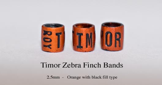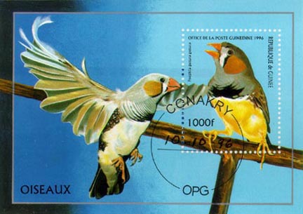 Male: Timor Zebra males have a smaller breast bar and the throat stripes are nearly gone compared to Australian Zebras (T. guttata castanotis). Between the beak and throat, the stripes are completely missing. The voice of the Timor is also much higher and the song is more rapid than the Australian Zebra. They are also generally smaller than their Australian cousins, but since the Australian Zebra is so variable in size due to selective breeding for the show bench, it is difficult to use this as a form of comparison. Some Australian Zebras are as small as a Timor Zebra. The Timor is approximately 10.5 grams. Female: Nearly indistinguishable from gray Australian Zebra Finch. Only the voice of the Timor Zebra finch can be used to determine Timor hens from Australian hens. A Timor Zebra male (click to view) See my Australian x Timor Hybrid Results Diet Breeder's Notes They will breed readily in cages or aviaries, as individual pairs and in a colony. My preference is to breed them in colonies whether in cages or in aviaries. It is interesting to see the interaction of the birds in this situation. I started breeding them in my standard 3' flight cage and would use bamboo to offer them some cover. I placed 3 pairs together in this setting with very good results. I also had very good results with a larger colony in an outside aviary. They are peaceful little birds that should be fine in most mixed colonies. I have them in a large flight with a few White-rumped mannikins with no problems with either bird. The only problem might be that the White-rumps are far outnumbered by the Timors and have not made any serious attempts at breeding thus far. Timors are very hyperactive birds. With their small size and active nature, they are like Owl finches in Zebra finch clothing. While I treat them very much like my Australian Zebras, the Timors cannot be considered as "indestructible". They are a bit more fragile and the aviculturist may do better to treat them like he would a small waxbill rather than just another Zebra finch. This is not to say that they are not hardy birds, only when compared to the Australian Zebra can they be considered more fragile. They do not seem to be able to take the lower temperatures that the Aus. Zebra can and may be more susceptible to disease. Overcrowding of the Timors will also bring diminishing returns as the young are abandoned more readily. Additional Notes The Timor should not be housed with the Australian zebra while breeding. They will readily hybridize and you will lose the unique characteristics of the Timor Zebra finch which is really the charm of the bird. I do not house the two together at any point. Young males that are housed with Australian Zebras may also lose some of the unique characteristics of their song. The Timor's song is more rapid and has more notes than the Australian. The late Dr. Luis Baptista referred to the those that were fostered as having a "lazy" song since it was not as complex as the original Timor song. (See my hybrid experiments with the Australian and Timor Zebra. I do not recommend others hybridize their birds. This was done for a very specific purpose and I will not be repeating it in the future) In an effort to help keep the Timors from being lost, I have started to use a band on all those I sell that identifies them as Timor Zebra finches. I recommend others do the same (see the bands) There are no known mutations of the Timor Zebra. I would be very hesitant to accept any new mutation as being developed exclusively from Timor lines. More likely, any mutations that are seen in the near future are more likely the result of introduction of established mutations in the Australian Zebra finch. The Timor Zebra finch can still be imported from its native habitat of the Lesser Sundas islands and Indonesia, yet there has never been a high demand for this particular species of Zebra and is considered rare in Aviculture. It has been rumored that they did exist in some aviaries in the US sometime in the 1970's, but later died out or were mixed with regular Australian Zebras and lost that way. A few aviculturists, myself included, are working to establish this unique species in the US. A stamp showing both the Australian and Timor Zebra finch from the African Republic of Guinea. (Click to view stamp) |